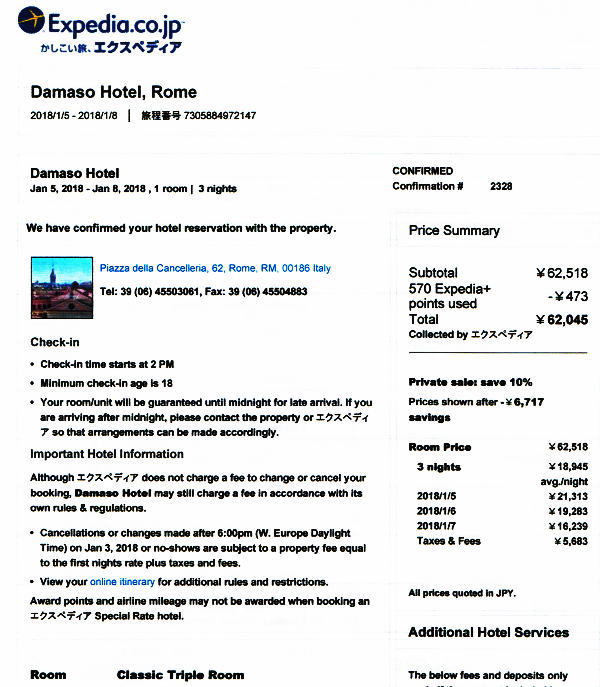 ローマDamasoHotel 2018年1月5日~3泊 |