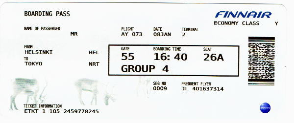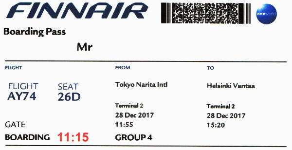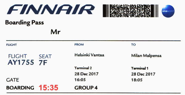 フィンランド航空航空券予約表/ (行き)成田空港~ヘルシンキ経由~ミラノ