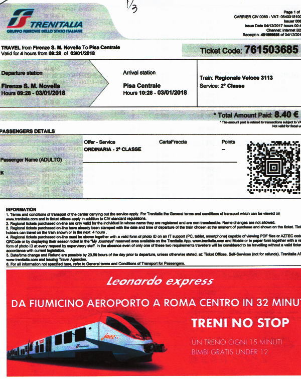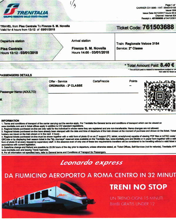 1月3日 ピサ~フィレンツェ帰り 電車チケット |