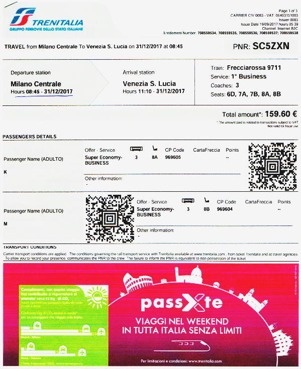 鉄道チケット:12月31日ミラノ~ヴェネツィア |
