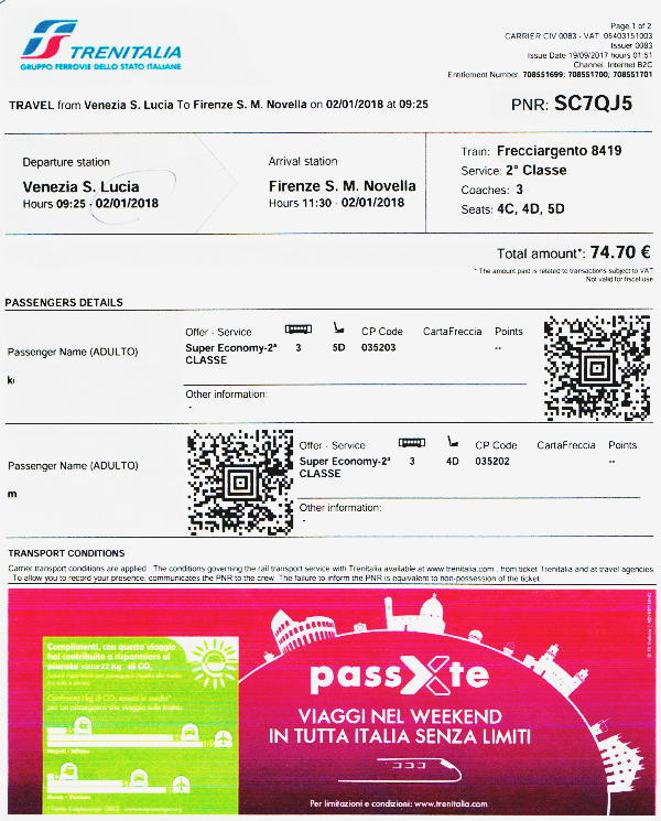 鉄道チケット:1月2日ヴェネツィア~フィレンツエ |