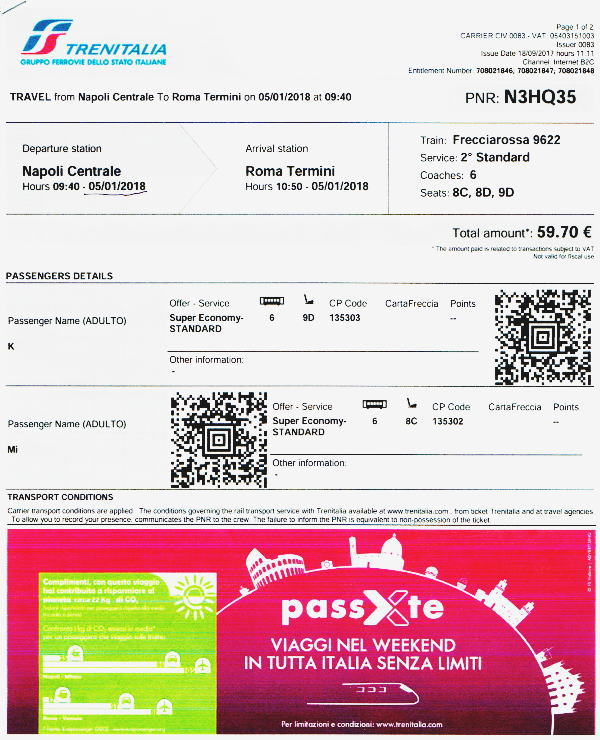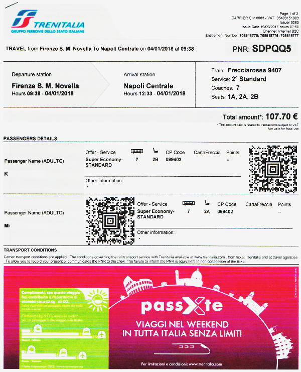鉄道チケット:1月4日フィレンツエ~ナポリ |