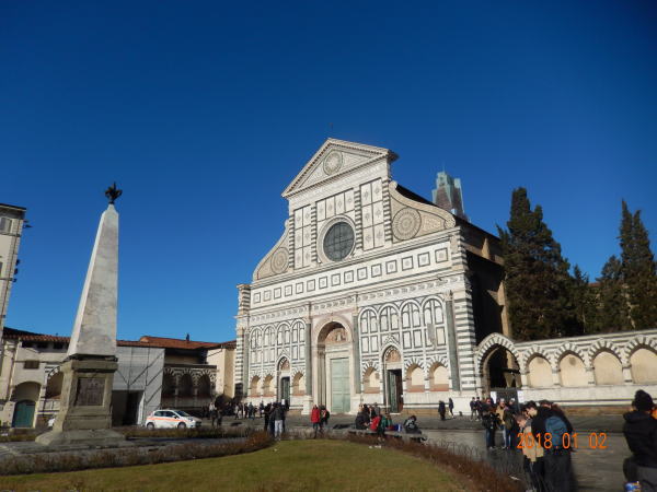 工事中のフィレンツエ駅前広場を背に旧市街へ歩くとすぐ、サンタ・マリア・ノヴェッラ聖堂。 教会を見ながら脇の石畳の道をを抜けていく。 |