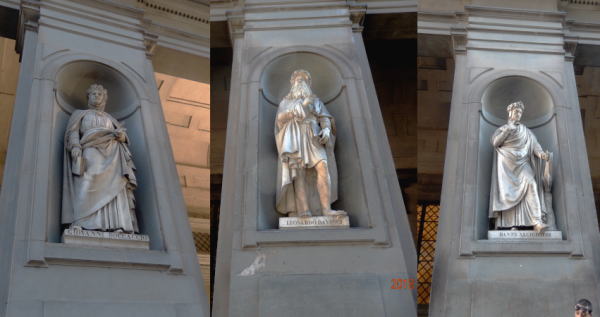 | 左から詩人.ボッカッチョ 中央がダヴィンチ 右は詩人ダンテ ウフィツィ美術館ファサードの肖像 |