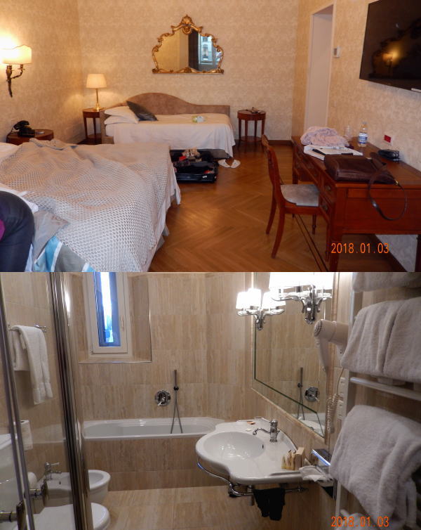 ホテル ペンディーニの部屋はWベッドとシングルベッド。 Mの体調もよさそうで、夕食後に湯船にいっぱい熱いお湯を張って交代で入る。 明日はピサの斜塔を見に行く予定。 |