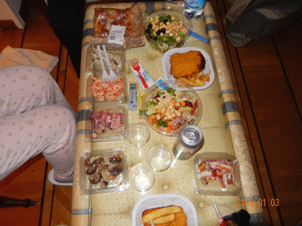 部屋の窓からきれいな夜景を見ながら夕食。 娘の買ってきた、ピザ、鳥のから揚げ、タコ、イカの酢の物、生野菜、フライドポテト、ビールなど。誰に気兼ねもせず3人でとてもぜいたくな気分の夕食。にぎやかにいただく。 |