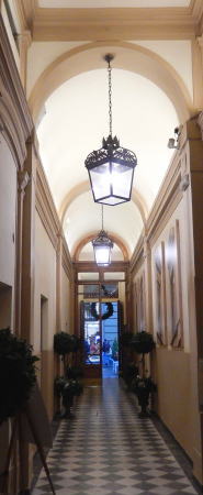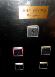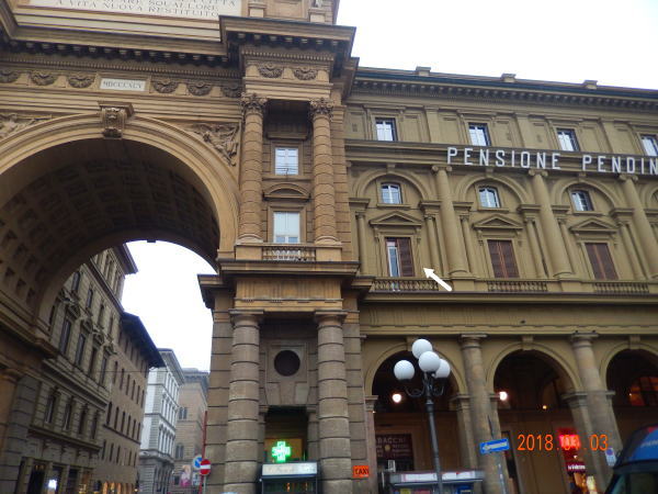 | フィレンツェの宿泊ホテルはレプッブリカ(共和国)広場に面したホテル ペンディーニ (Hotel Pendini)。石造りの重厚そうな建物でなかなか良い雰囲気。 大通りから狭い通路を入って4階がレセプション。チェックイン時間前なので荷物を預けて街に出る。 今日はMの体調がだいぶいいようで少し安心する。 |