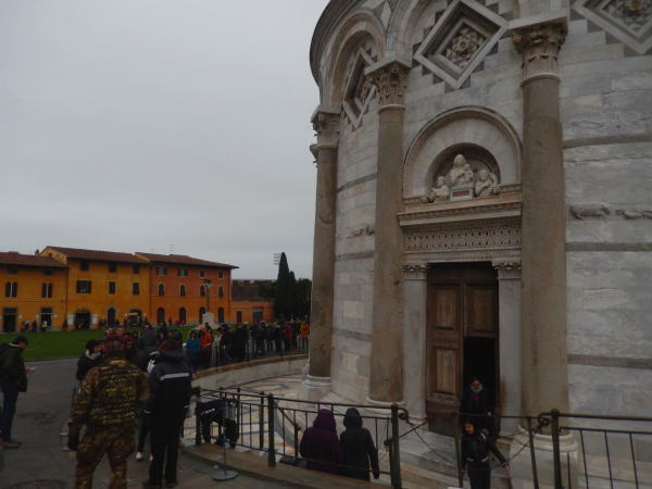 | 「ピサの斜塔」に上がる入口。 なが~い列ができている。 帰りは来た時と同じ道を中央駅に戻る。 |