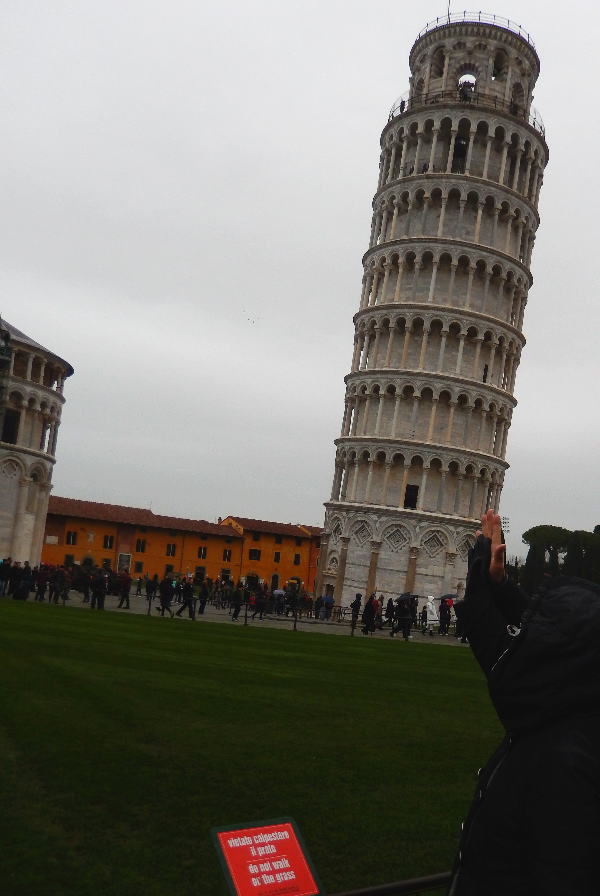 みんなで定番の倒れそうな斜塔を手のひらでささえるポーズで記念撮影!(ちょっとずれている) |