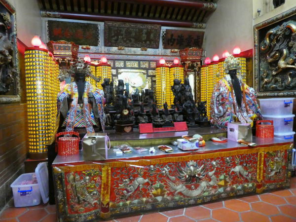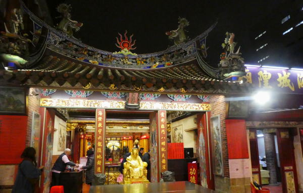 部屋に荷物を置いてすぐに街歩きに出る。MRT松山南京駅~大橋頭駅へ。そこから迪化街(てきかがい)へ夜道を尋ねながら歩き商店街中ほどにある霞海城隍廟というお寺をお参りする。(娘の縁談のお礼参り) 迪化街にはおよそ370棟の建物が並び、その半分程度178棟が歴史的建築物とされている。 |