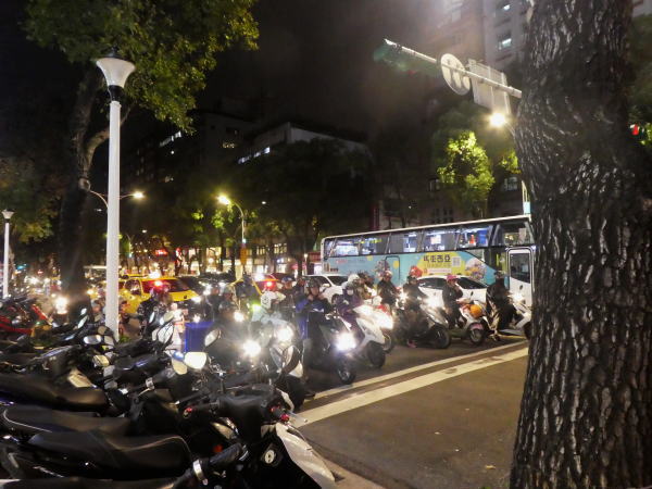 「中山駅」から夕食レストラン京鼎楼へ。台湾も人々の足は自転車でなくバイク。その数はすごい。 |