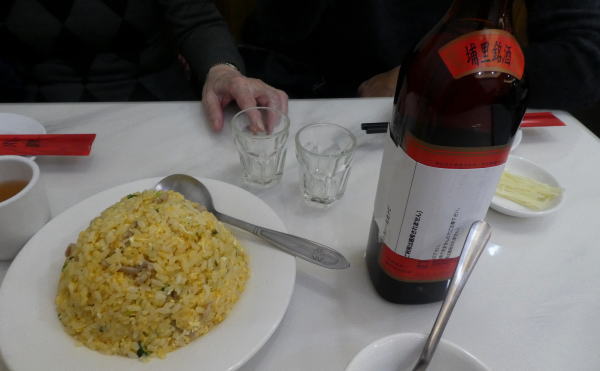 店内はほとんど日本人。小籠包、炒飯など定番を注文。最初の驚きは、運ばれてきた老酒のボトルに、下の印刷を隠しているのか、テープで紙片が張りつけられている。 |