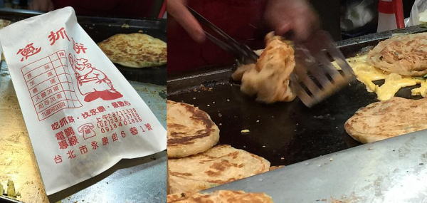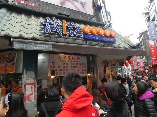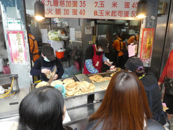 その先で行列の店を発見。何を売っているのか分からないが、女子二人は興味があると言って、列の後ろについて買ってくるというので、永康公園で時間をつぶして待つこと20分。この店で売ってるのは天津葱抓餅といって永康街の人気店だった。 |
