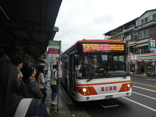 MRT木柵駅で下車。駅前を右に歩くと直ぐに平渓.十份方面行きの795バス停はあった。 少し行列が出来ていたが間もなく10:20発のバスが到着。席はいっぱいだったが地元の若い女性から席を譲られる。恐縮して遠慮したが強くすすめられ親切を受け座るが、娘さんはしばら立ったまま。10分くらい走った山道のバス停で娘さんは下車、窓から会釈すると笑顔で手を振ってくれた。 |
