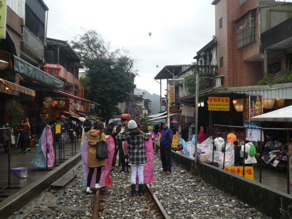 商店に入りトイレを借りながら、ランタン(天燈)をお願いする。2色/4色など種類もいろいろあり願い事の数により料金が設定されている。 その先の台鉄.平溪線の十份駅前に軌道の両側に店が並び線路上にはすごい人。 |
