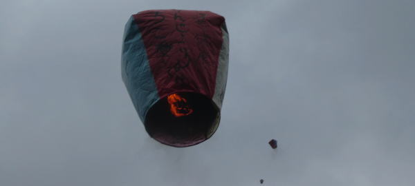 ランタン揚げには決まったパターンがあって、店員さんの指示に従い火の入ったランタンを3人で持ち、渡したカメラやスマホにポーズをとらされ、記念撮影が終わると、3,2,1の掛け声とともに手を離す。ランタンは待っていたかのように ロケットのようにすごい勢いで天高く舞い上がっていった。 |