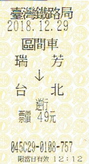 瑞芳~台北まで、普通悠遊カードはOKだが、優待カードは使えないと言われて窓口で台北まで49元(180円)の切符を購入する。どうしてか理由が解らないかった。 |