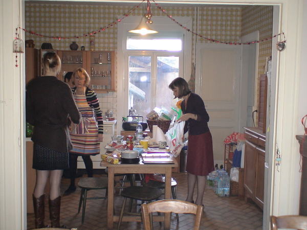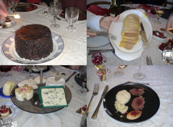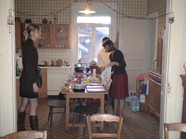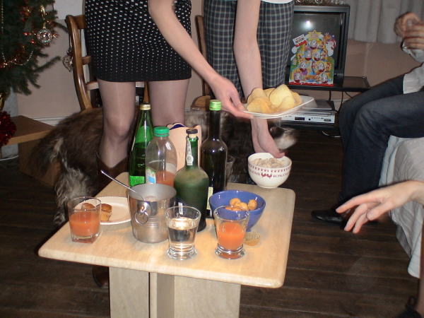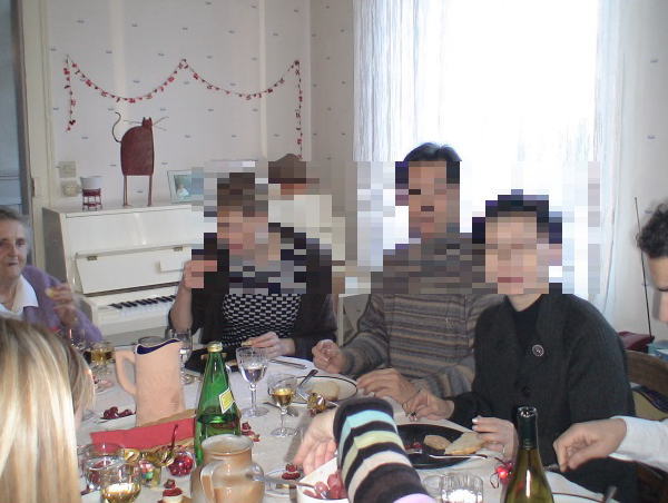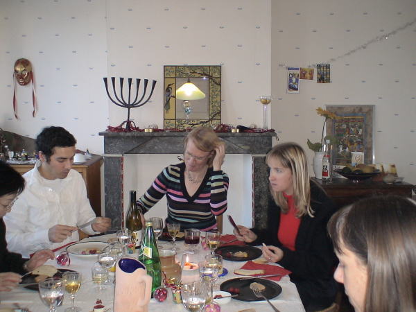 当たり前だが靴を脱がずに入って、廊下の先左が居間。 静かな老犬ゴーストの静かに歓迎とは反対に、クリスマス休暇中の妹クレールとアレキサンドラ・クレールの恋人・おばあちゃん・アグネス妹さん達から賑やかに大歓迎を受ける。全員座って食前酒とクッキーでイタリア旅行の感想など聞かれたりしばし歓談。 1時間程して廊下の向かい側の食堂に移動、テーブルの上はすでに綺麗にセッティングされている。 |