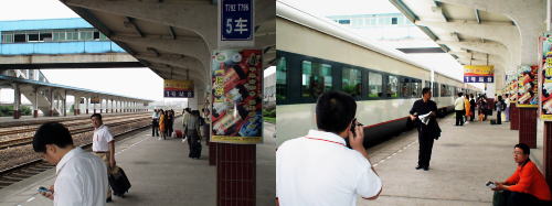 30分前になると改札が始まりホームへ、すでに列車が止まっていて券面の5号車12・13席を探すとそこは硬座(2等車)、よく見ると券面には硬座の記載、切符買うとき販売員が何か言っていたのは軟座(1等)がなく2等を発券した事だったようだ、席に座るり回りの人に行き先紹興を確認。