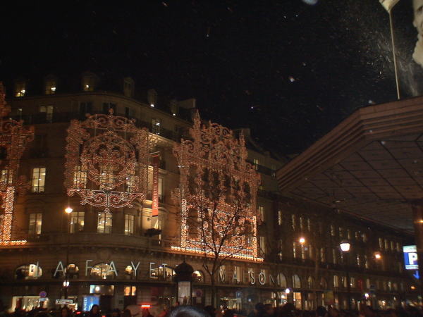 モンパルナス界隈をしばらく歩いた後ホテルに戻り昼寝する。 16:00ホテルで食事して17:00地下鉄でマドレーヌへ、ラファイエット周辺はとにかくすごい人の波プランタンでが入口で人工雪が勢い良く噴出して一面の空を舞っていた。 |