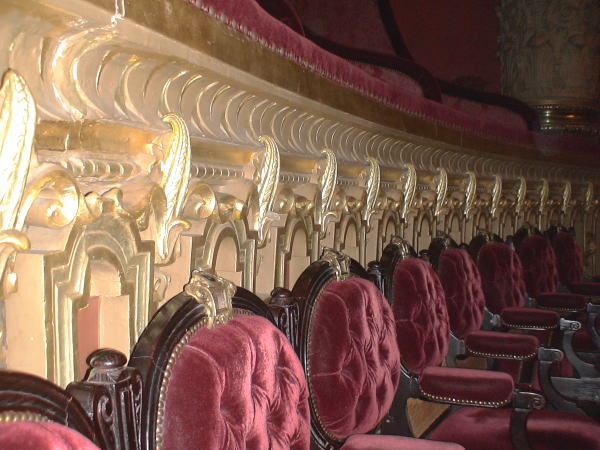 オペラ座開場時間の18:45入口から着飾った人などと共に階段を上がりクロークでコートなど預け、館内案内係りに予約チケットのバルコンNo.187.189へ案内してもらう。 |