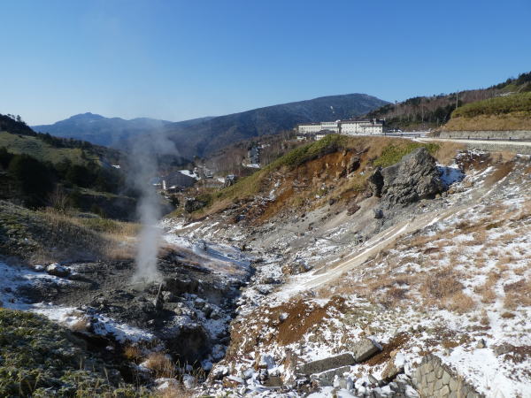 火山性ガスの噴き出す「空吹」の遠く向こうに万座プリンスホテル |
