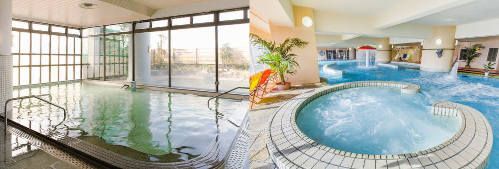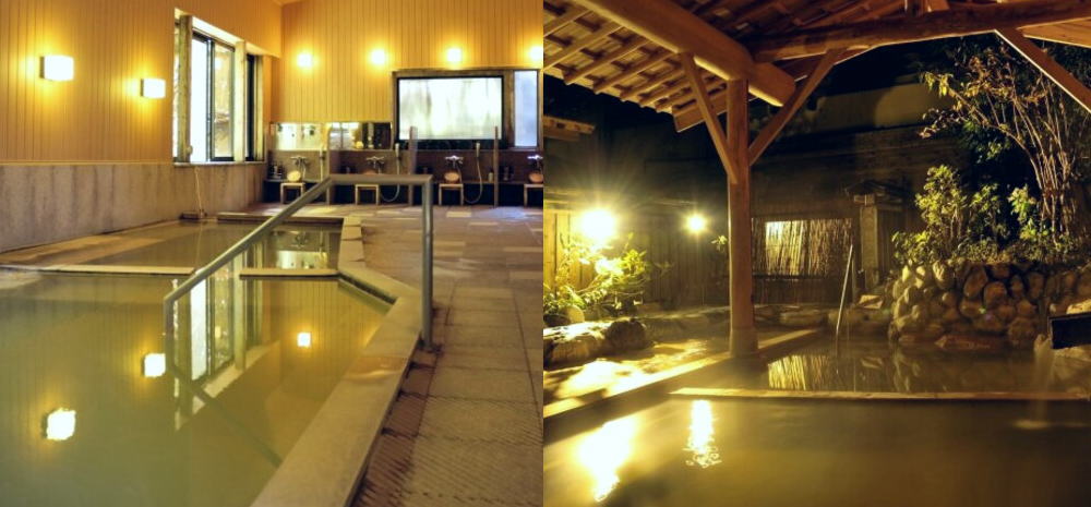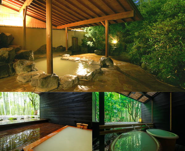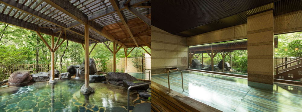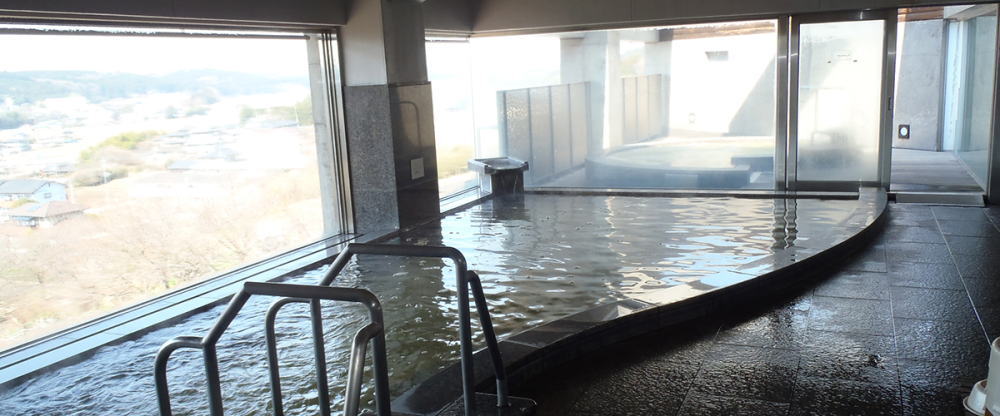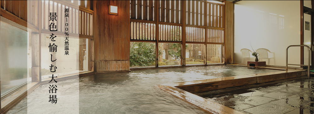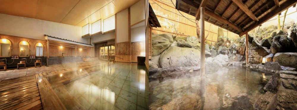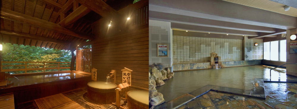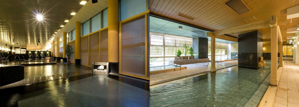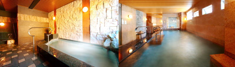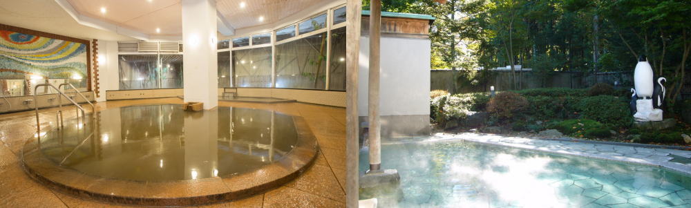 大浴場は男女とも1階と2階にあり、1階は滝の流れる大浴場、2階には天望大浴場があります。1階の大浴場は内湯の外に露天風呂が3ヶ所あり、それぞれ個性のあるお風呂で湯めぐりをお楽しみいただけます。2階の天望大浴場は、内湯と一体となった露天風呂が大好評でサウナ風呂も併設されており、水風呂もございます。磯部温泉は塩分のある温泉で、肌がすべすべとして美肌効果があり、美肌の湯と呼ばれ女性には大評判です。 |