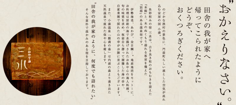 房総半島の南東に位置するこの地域は、一年を通して温暖な気候と黒潮の流れる豊かな漁場として知られております。日蓮宗大本山のひとつ、誕生寺の門前に居を構える当館周辺では、清く澄んだ空気の中、港町らしさの残る風情ある町並みをご散策いただけます。夕食は、房総の恵みをふんだんにとりいれた郷土会席料理をお部屋にてご提供させていただいております。また、小湊温泉願満の湯は内浦の森より湧き出た天然温泉。身体を芯から温め、冷え症や疲労回復、お肌などに効能がございます。