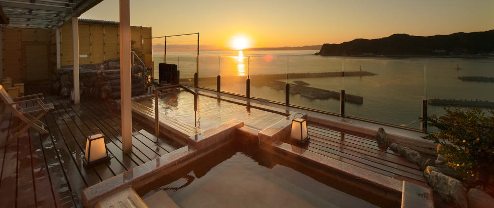 半露天風呂がある「日蓮の湯」は和風感覚の総高野槇造り、「南楽の湯」は南国ガーデン風で200㎏ある2個の陶器製の半露天風呂があり、朝夕男女交代でご利用できます。それぞれデザインの異なった豪華な石造りの主浴槽がございます。又2カ所ある貸切風呂は海の眺望とBGM、アロマランプでリラックスした入浴タイム。洞窟ムードと和風ムードからお選びいただけます。ノスタルジックな足湯サロンも貸切風呂と同じ眺望できれいな夕日が眺められます。重炭酸そうだ泉質の柔らかな湯で無色透明な美肌の湯。