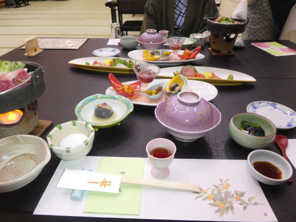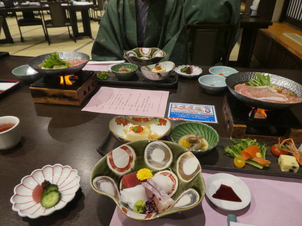 夕食は一階の大広間で食事時間が宿泊者別に3つに分けられ、密にならない工夫がされていた。料理は出来立てが並べられとても美味しかった |