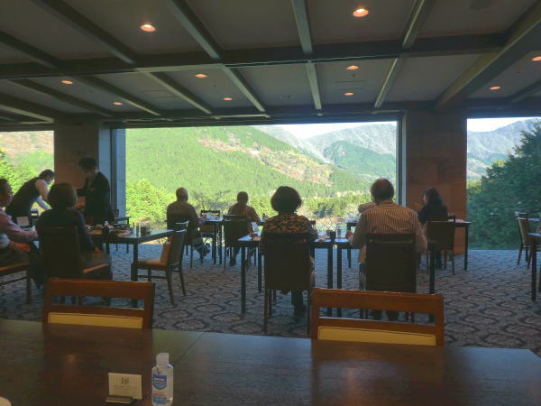 ゴルフ場併設レストラン、ゴルフ場のレストランは例外なく美味しい。ここの朝食も最高に美味しかった。窓から箱根外輪山の眺望がホテルの自慢。昨日登った金時山がそびえている。それほど厳しく高い山でないが老齢夫婦にしては踏破でき誇らしく眺められた。 |