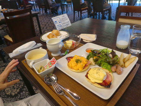仙石原プリンスホテル朝食、朝食は夜と同じ、ロビー棟 3Fレストラン「グリル」。Mは洋食、Kは和食を選択。
