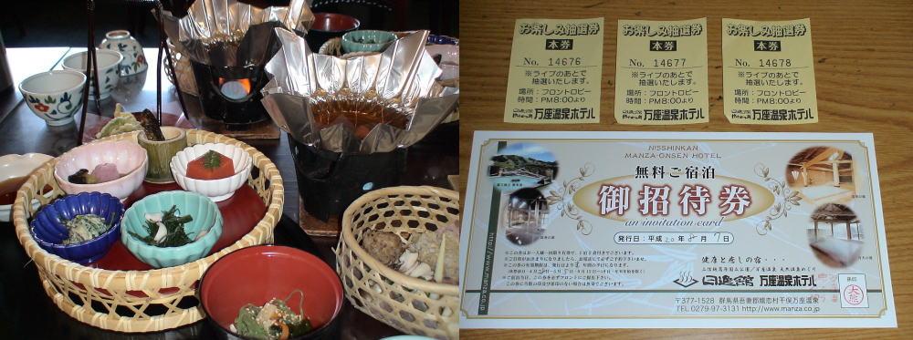 | 孫のYちゃんと3人で万座温泉。この温泉はYちゃんの患っているアトピーに効くという、2日ばかりの入浴では効果のほどはわからないが、とてもいい湯であることは肌で感ずる。夜、宿のご主人やスタッフによるアトラクションで抽選会があり特等・無料宿泊券が当たる。 |