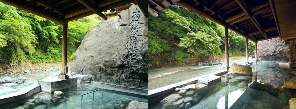 | 渓流露天風呂に「南無妙法蓮華経」が刻まれた岩 |