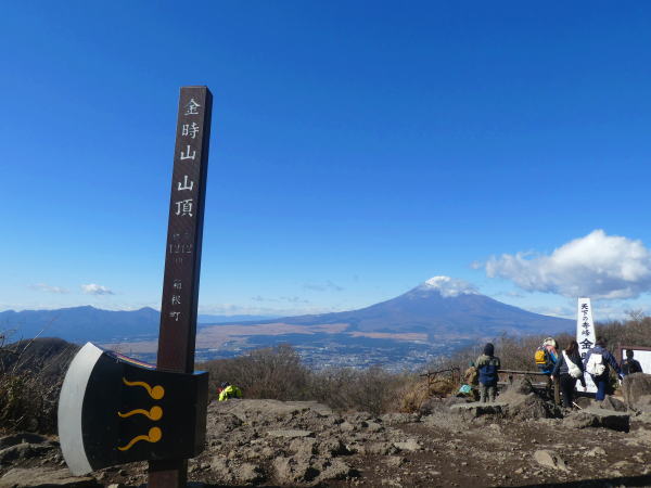 金時山の登山口「金時神社」はホテルから15分程ゆるやかな坂道を登る。金時神社を お参りして参道から金時登山道に入る。登山開始から一時間、公家神社分岐で休憩。ここから山頂までは急な登りだったがやっと山頂に到達。風は強いが空気が澄んでいて素晴らしい眺望を充分満喫。