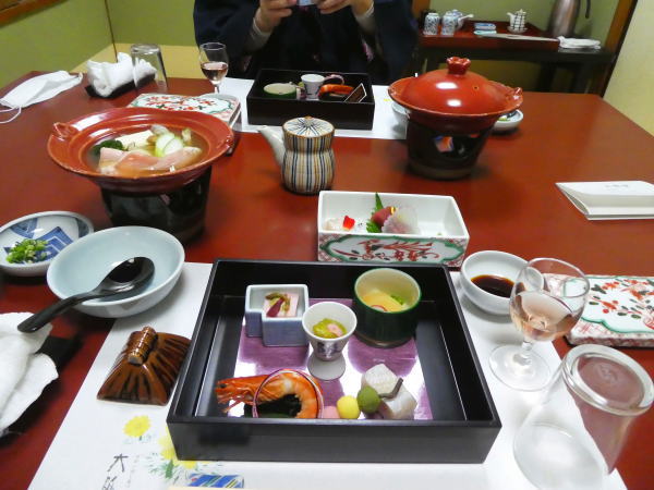 夕食は2階の個室・懐石料理。和室で二人だけの夕食はゆっくり静かでいい。大阪屋オリジナル・ボトルワイン&料理は素材もよく味付けも薄味でとてお美味しい。