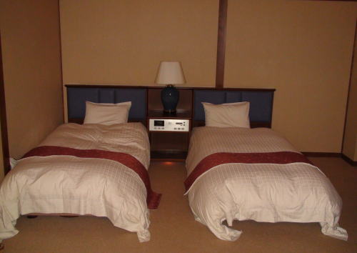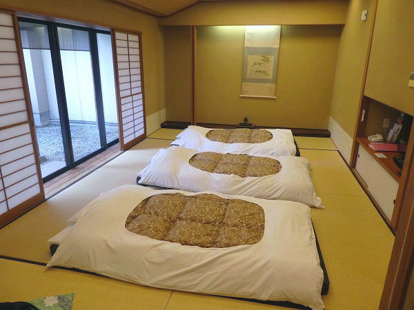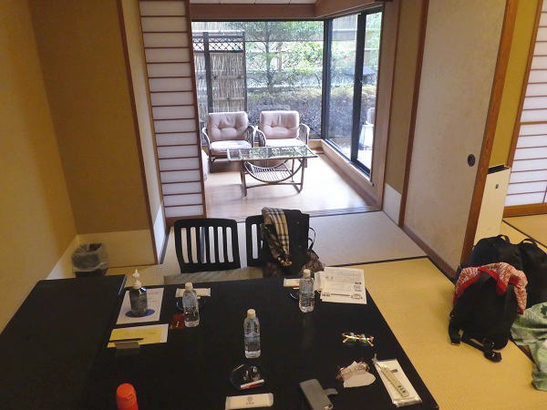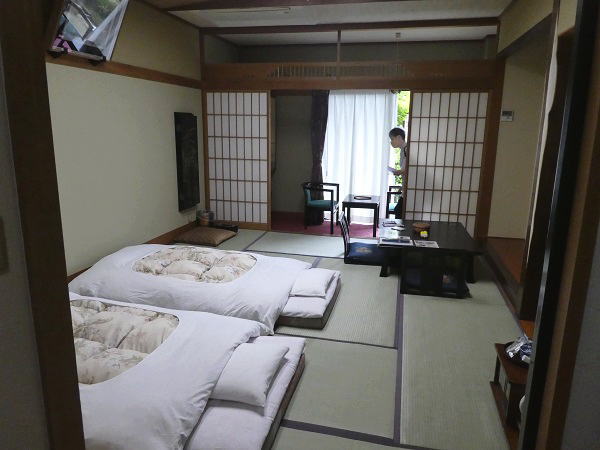 | 談露館の三階の部屋は、和室二間と応接間に坪庭、洗面所とお風呂も和風で、ゆったり広くていい部屋。部屋に入るとすでに布団がひかれている。 |