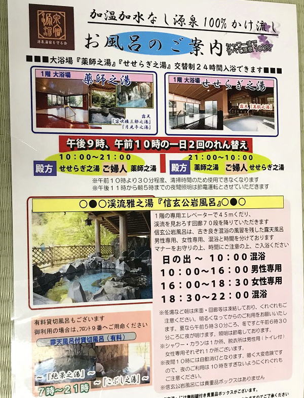 | 宿のうしろに早川・湯川渓谷とつり橋を渡る散歩コース | 毎分1600㍑以上の自噴泉 | |||||||||||||||||||||||||||||||||||||||||||||||||||||||||||||||||||||||||||||||||||||