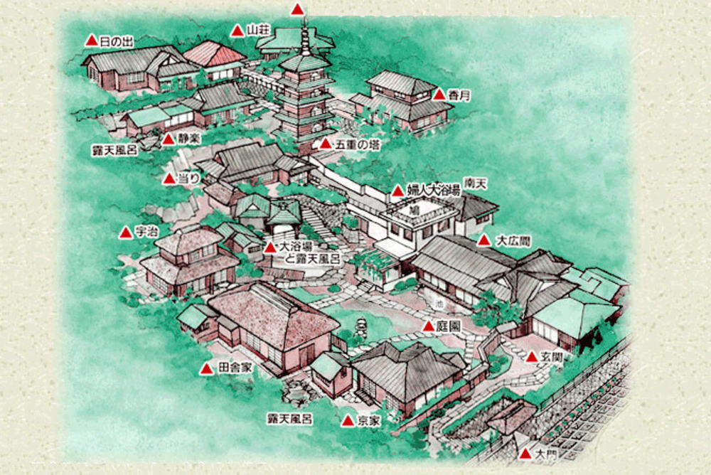 | 2つの大浴場にそれぞれ「山渓之湯」「飛山之湯」の展望露天風呂が隣接 | ||||||||||||||||||||||||||||||||||||||||||||||||||||||||||||||||||||||||||||||||||||||||||||||||||||||||||||||||||||||||||