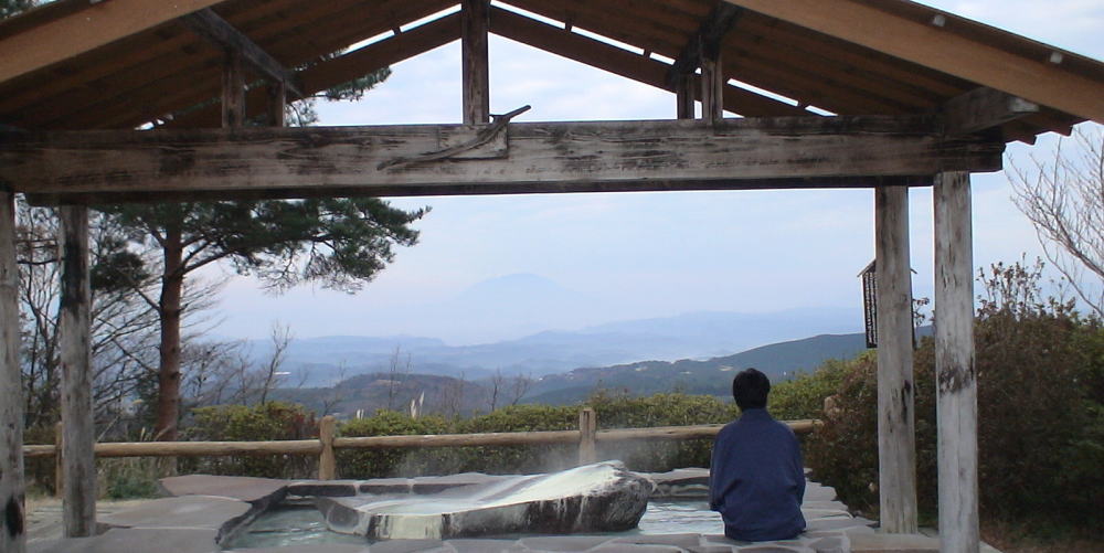 | 大露天風呂の先に由布岳 |