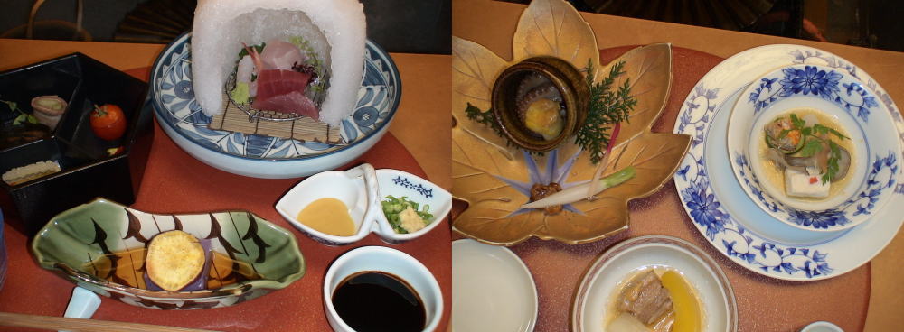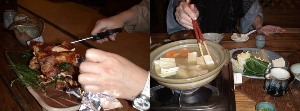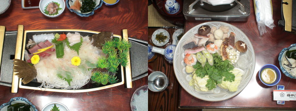 夕食は下の座敷を仕切り、珍味をいただく |