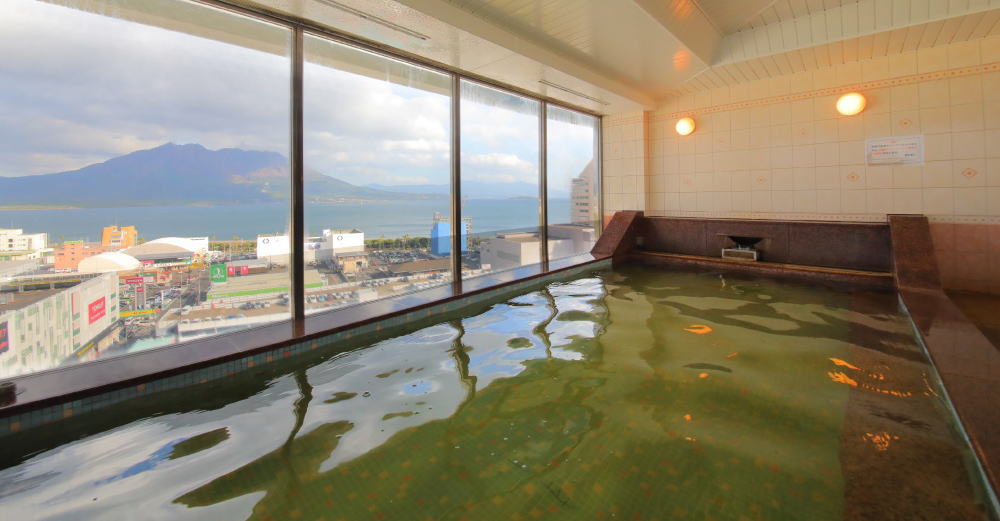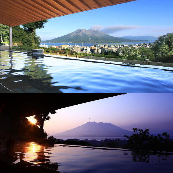 ホテルの温泉大浴場の露天風呂は、桜島を正面に見て