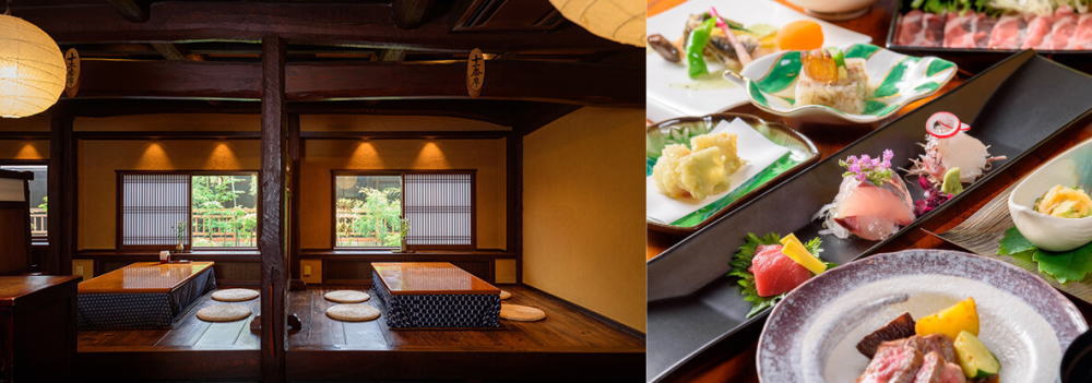 旬の素材や地産の素材などにこだわった創作会席料理です。和風と洋風が融合したような、鮮やかな色彩と豊かな味わいをご堪能ください。こうした料理の中には、料理人の気持ちが込められています。当宿の料理人・片山和久。お客様にお言葉を頂いているノートには、料理だけでなく、彼自身への感謝も多く含まれています。お客様への奉仕の心、料理に対する志、食に対する理念が、お客様達のお腹と心を満たしています。