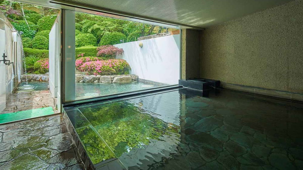 | 天然石の大浴場。庭園露天風呂に向かって開かれた窓(アルカリ性単純温泉) |