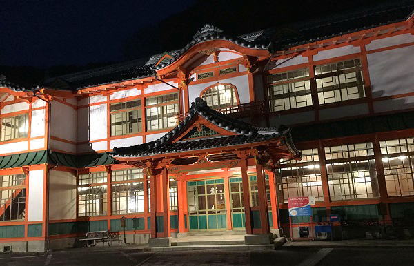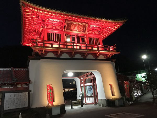 夜ライトアップした楼門と新館
