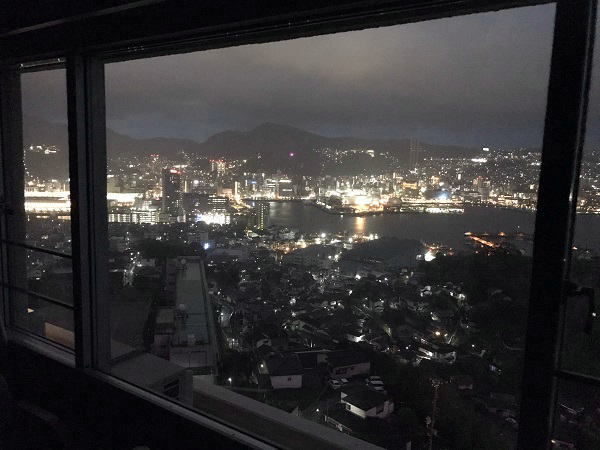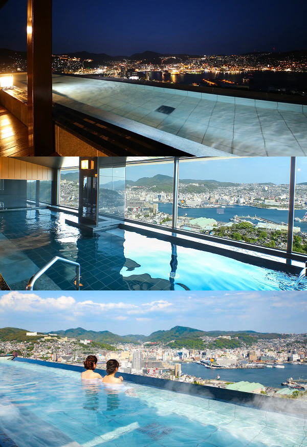 11階大浴場は湯船が内側と露天2つ。どちらも長崎市内の大パノラマ。