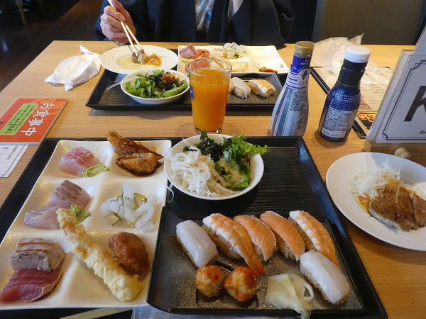 夕食は5時半からイカ・エビ・サーモンのお寿司やステーキ、さつま揚げ、あんかけ焼きそば、中華料理が美味しい。食べ過ぎお腹が膨れお相撲さんみたい。