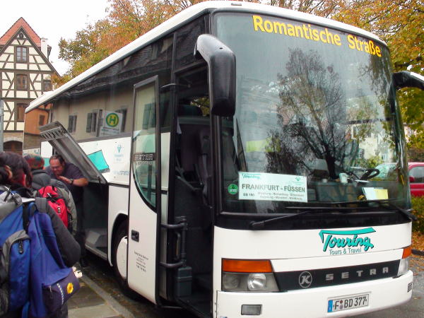 ローデンブルクからのバスでは鄭丞鎬の他、フッセンのノイシュバンシュタイン城で再会する事になる二組のカップルと一緒だった。一組は上写真のバスに荷物を乗せているカップルともう一組は次のバス停で乗ってきた同年輩のご夫妻だ。他にも日本人が数名乗っていて、バスの車内アナウンスはドイツ語・英語・日本語で案内された。 |