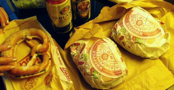 ![]() 駅の売店で買ったハンバーガーとプレッツェル。ビールによく合う。 |