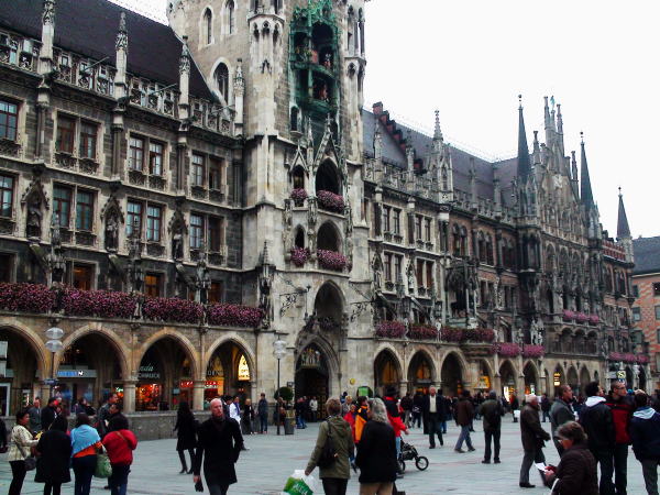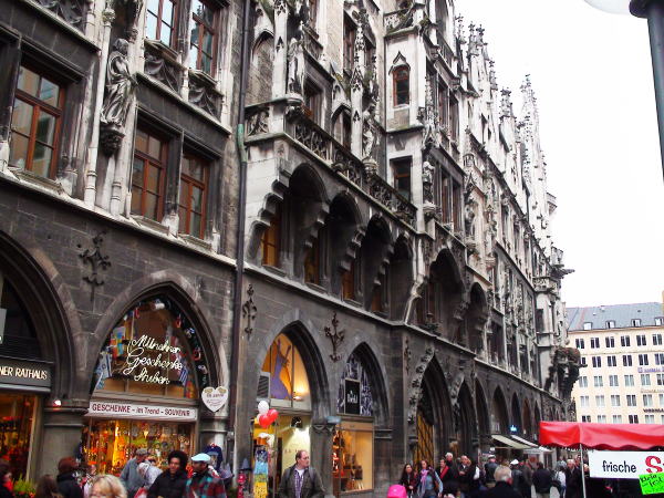 聖ミハエル教会を左に見ながらマリエン広場に出ると、そこには新市庁舎の重厚で巨大な建物がドーンと構えていた。 新市庁舎というが1867〜1909年建築されたとても古い色合いの建物で新とはいえない感じだ。そこにはドイツ最大の仕掛け時計がある。 |
